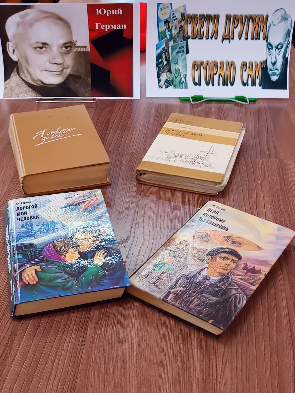 4 апреля 2025 года исполнилось 115 лет со дня рождения Юрия Павловича Германа, классика русской литературы, прозаика, драматурга, киносценариста. Творчеству писателя был посвящен литературный час «Светя другим, сгораю сам», проведенный 16 апреля в Легостаевском ДК для членов клуба «Огонёк».