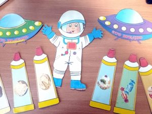 Ребята с удовольствием отгадывали космические загадки, узнали много интересных фактов из жизни космонавтов, посмотрели занимательный мультфильм про Белку и Стрелку. А затем из бумаги смастерили своими руками яркие, красивые космические поделки.