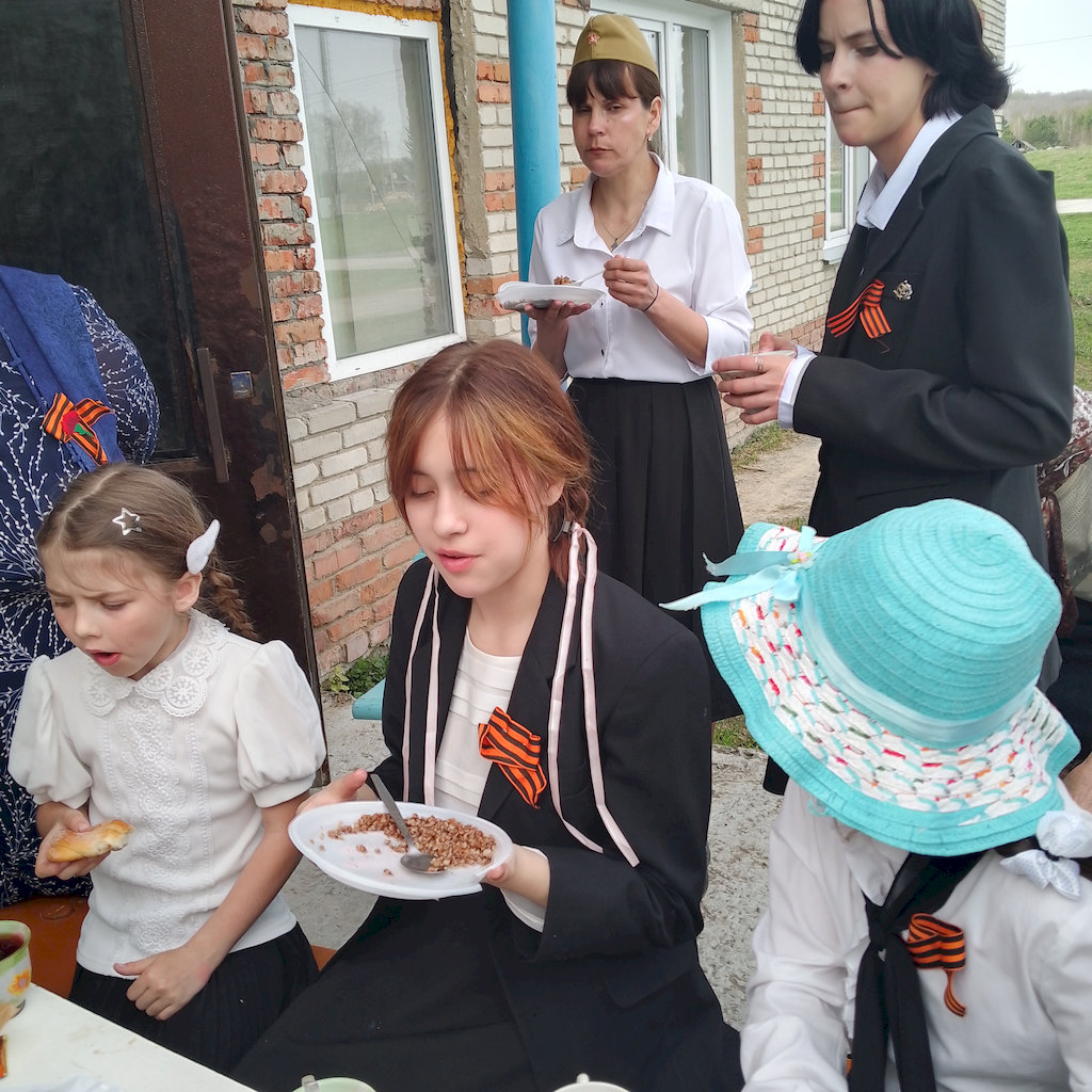 А после концерта на улице всех ждала полевая кухня. Все желающие могли отведать гречневую кашу с тушенкой и черным хлебом, чай с булочками. Дети -волонтеры провели Акцию «Поздравительная открытка» — поздравили детей войны с праздником и подарили им открытки, сделанные своими руками. Весь день в деревне звучали военные песни и царила атмосфера победного мая!