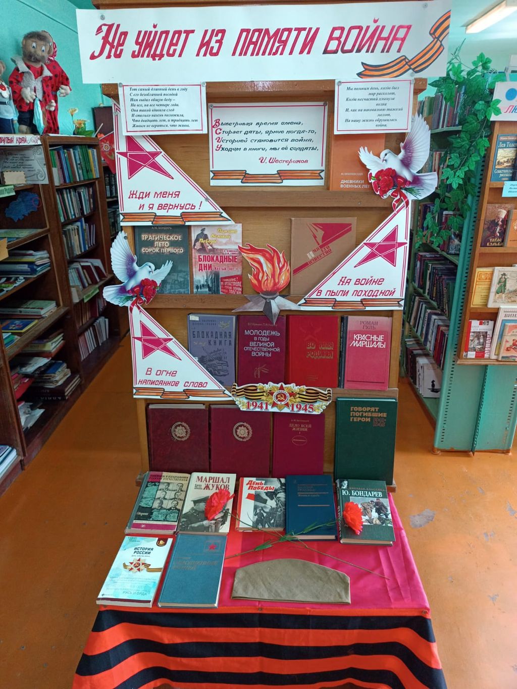 В библиотеке к мероприятию оформлены книжные выставки «Не уйдет из памяти война», «И помять о войне книга оживляет», «Прочитанная книга о войне-мой подарок к празднику Победы».