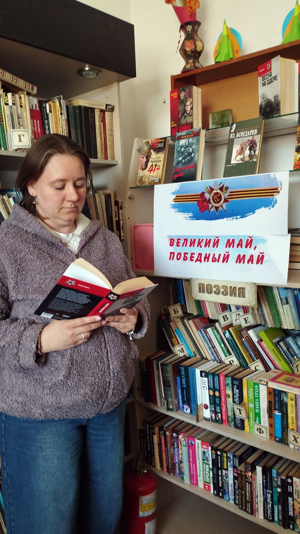 Присутствующие ознакомились с книжной выставкой «Великий май, Победный май», на которой были представлены книги: А. Твардовский «Василий Тёркин», Л. Славин «Два бойца», О. Берггольц «Дневные звёзды», Б. Васильев «А зори здесь тихие», Ю. Бондарев «Горячий снег» и другие. Библиотекарь провела обзор книг, рассказав не только о произведениях, но и привела интересные факты из жизни некоторых авторов. Например, один из самых популярных авторов военно — приключенческого жанра Г. М. Брянцев — участник Великой Отечественной войны, военный разведчик. Его роман «По ту сторону фронта» посвящён всем безвестным героям, сложившим головы за свободу Отчизны в глубоком тылу врага.