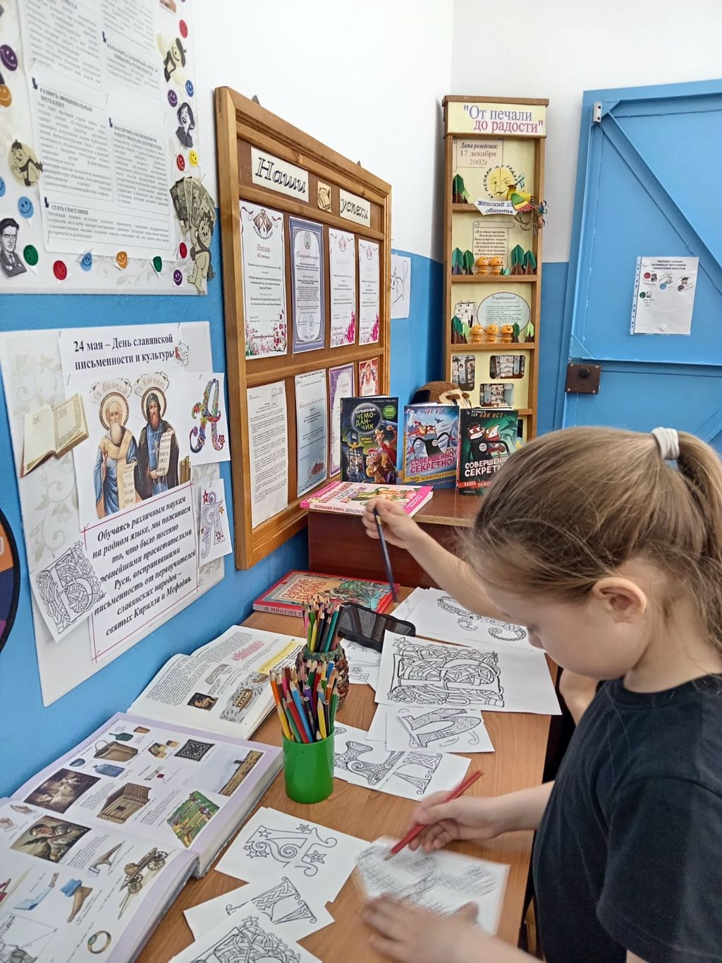В завершение мероприятия каждый желающий мог проявить свои творческие способности в подборе цветовых сочетаний для раскрашивания необычных узоров букв, похожих на старославянские сказочные буквицы.