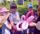 Взяв мелки в руки, ребята с завязанными глазами, рисовали портрет Бабы Яги. Сказочная героиня осталась очень довольна рисунками! Но пожаловалась, что никто не дарит ей цветов. И тогда дети, с помощью шаров, сделали для Бабы Яги цветы! Очень обрадовалась Яга, поблагодарила детей и устроила для них дискотеку. На ноте радости и веселья закончился праздник, дети получили сладкие подарки, а Баба Яга со своей свитой отправилась в лес, где находится её избушка.