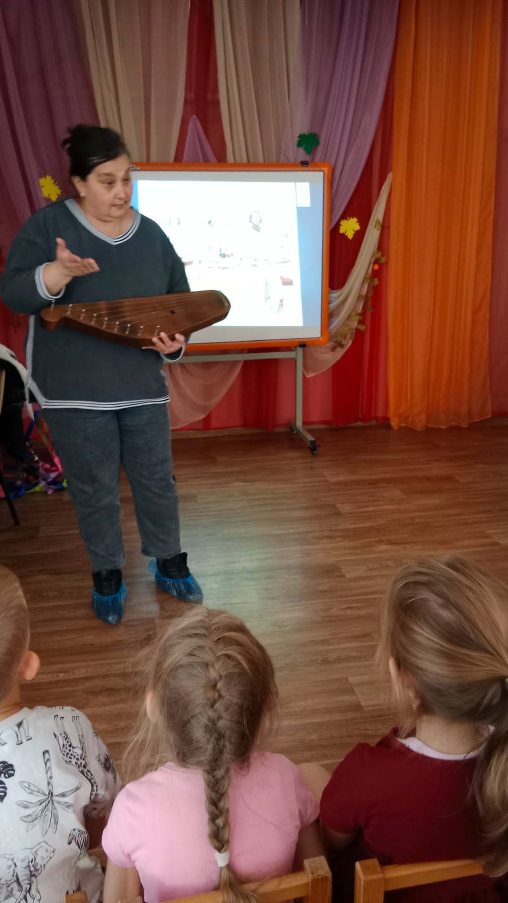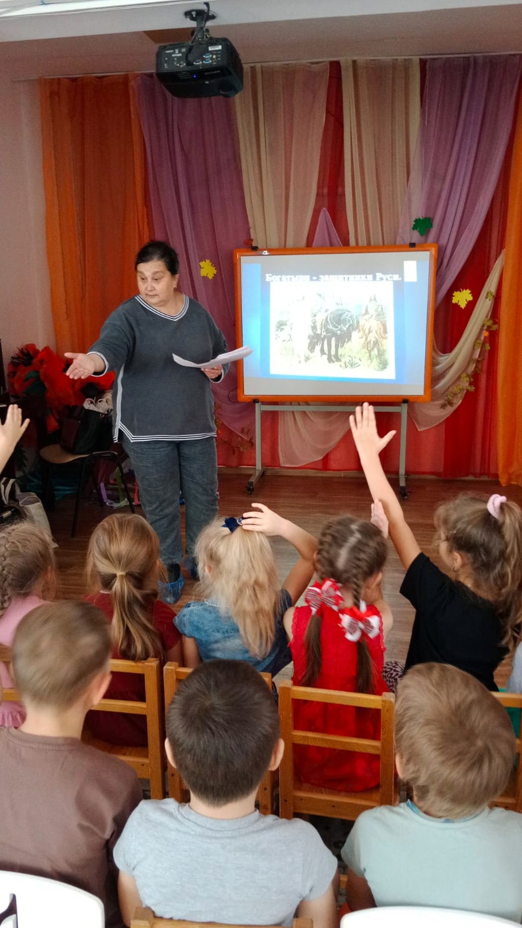 Для подготовительной группы прошла беседа-игра «Слава русская, сила богатырская». Ребята узнали о том, что былины всегда пелись – распевно говорились под перебор гуслей. Вспомнили самых известных русских богатырей: Илью Муромца, Добрыню Никитича, Алешу Поповича. Рассуждали о том, какими качествами должен обладать настоящий богатырь, а также познакомились с картиной В. М. Васнецова «Три богатыря», отгадывали загадки про оружие и доспехи богатырей, сделали богатырскую зарядку, узнали о том, что в честь Ильи Муромца назван бомбардировщик, ледокол, круизный теплоход и даже бронепоезд. В завершении мероприятия дети поиграли на гуслях.