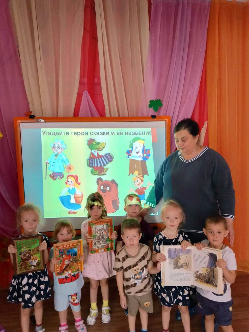 Младшая группа отправилась в путешествие по сказкам. Литературная игра «По дорогам сказок» состояла из викторин «Угадай сказку», «Узнаем героев сказок по их портрету», «Угадай сказку по иллюстрации». Малыши познакомились со сказкой В. Г. Сутеева «Дядя Миша».