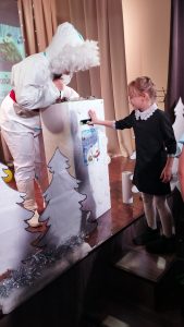 В гости к детям пришёл Снеговик со своим ассистентом. Зал наполнили звуки волшебной музыки и разноцветные огни. Дети задорно собирали снеговика из больших пазлов, разложенных на полу. Сказочный герой поведал детворе об особенностях празднования Дня рождения Деда Мороза и предложил каждому написать ему поздравления. Ребята от души поздравляли доброго волшебника с его днем: писали стихи, добрые слова и рисовали забавные поздравительные открытки, которые потом опустили в волшебный почтовый ящик. Какой же день рождения без веселья? Ребята вместе со снеговиком играли в «фанты», пели песни, читали стихи и даже наряжали ёлочку. А сколько радости доставила детворе игра в снежки! Виновник торжества, Дед Мороз, не смог прийти в этот день в ребятам, но оставил для них видеообращение, в котором поблагодарил за подарки, за выполнение задание, пожелал здоровья и хорошей учёбы. В завершении мероприятия ребята получили сладкие подарки от снеговика и море позитивного настроения.