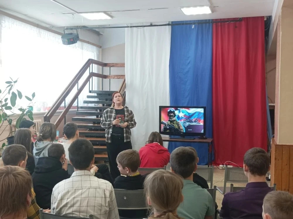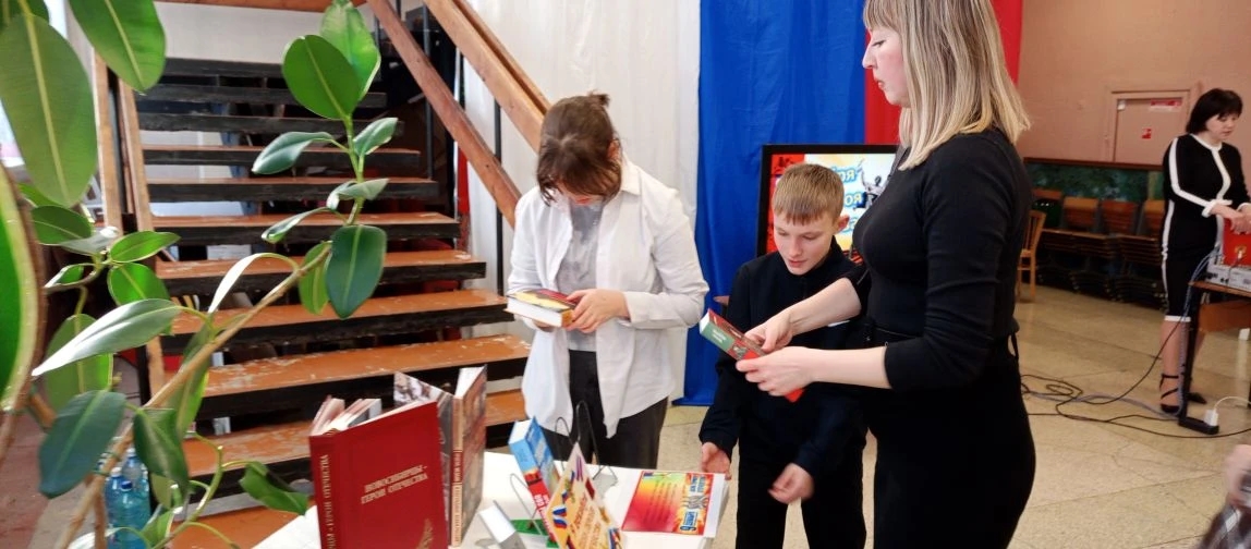 Также библиотекарь провела небольшой обзор современной литературы. В частности, на выставке была представлена серия книг «Битва за Новороссию» автора Михаила Фёдорова. В них искренне и пронзительно рассказывается о героях наших дней, живых и павших, защищающих страну в зоне СВО. Библиотекарь подчеркнула, что на страницах этих изданий отражена история, которая пишется сегодня. И, возможно, именно эти книги войдут в историю культуры нашего времени, а дети и внуки сегодняшних школьников будут изучать их на уроках.