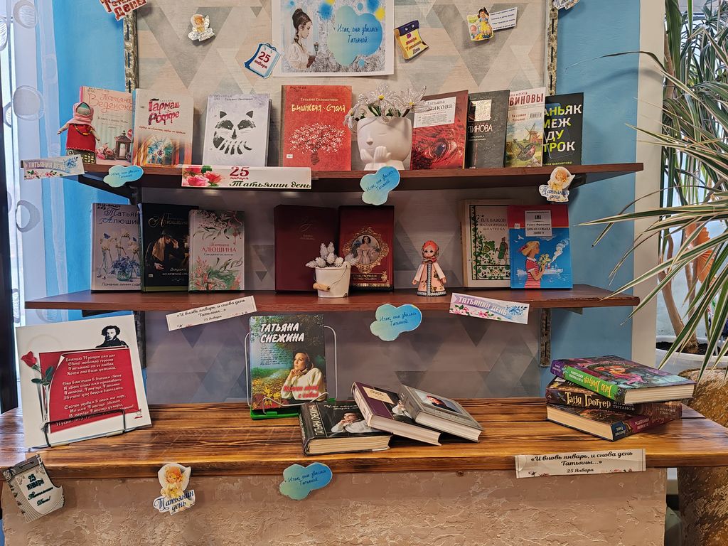 На выставке заняли свои места книги, вышедшие из-под пера авторов-Татьян. Палитра получилась яркой и многожанровой: от поэзии и любовных романов до лихо закрученных детективных историй. Не менее внушительной оказалась та часть выставки, которая представила Татьян – героинь разных произведений. Здесь нашли своё отражение классика и современность, взрослая и детская литература. На полках по-соседски расположились крестьянская девочка Танька Ивана Бунина и Танюша Павла Бажова, Тани Рувима Фраермана и Дмитрия Емца. А Татьяна Ларина «отметилась» не только в исходном романе светила русской поэзии Александра Пушкина, но и в современной детективной истории.