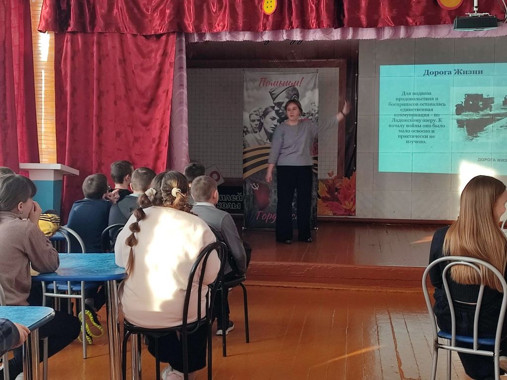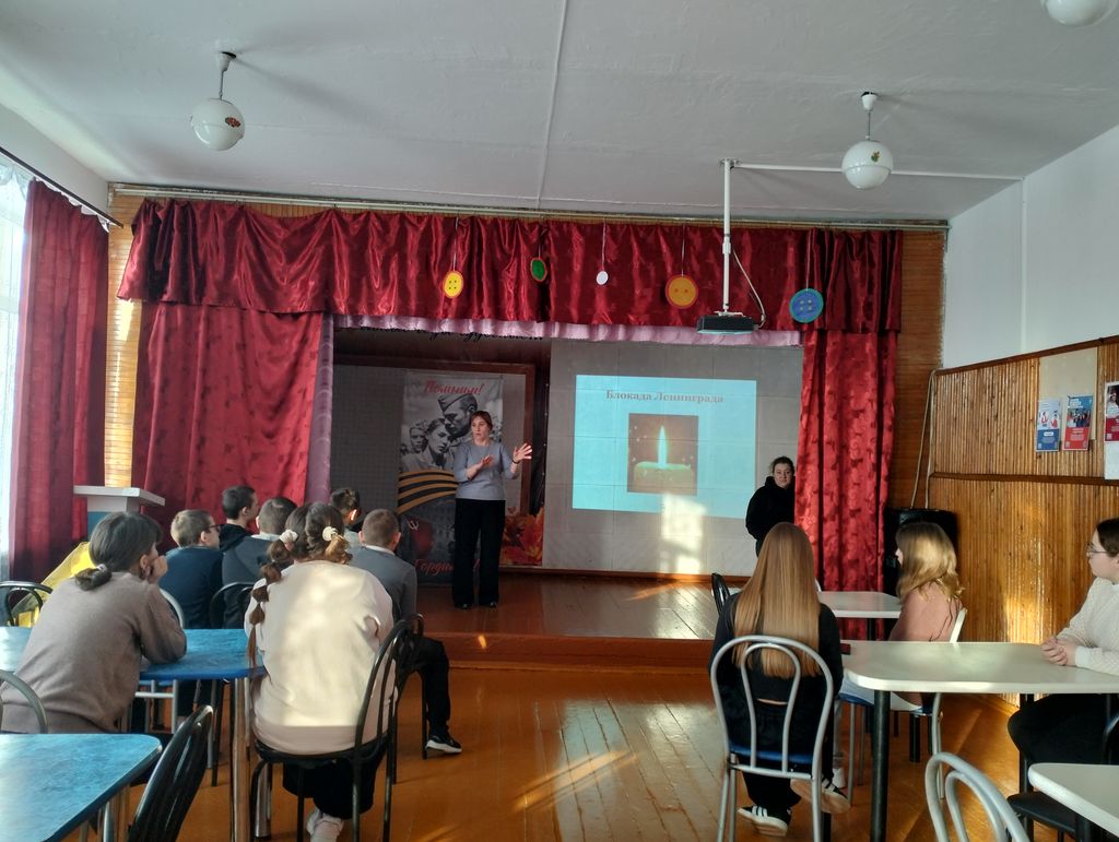 Библиотекарь рассказала ребятам о тяжелых испытаниях, выпавших на долю жителей осажденного закрытого города Ленинграда: о голоде и холоде, о детях и женщинах, работавших наравне с мужчинами на заводах, о защите и обороне Ленинграда советскими солдатами, о строительстве спасительной «дороги жизни» через Ладожское озеро. Особенными чувствами ребята прониклись к судьбе маленькой девочки Тани Савичевой, которой пришлось пережить ужасы блокады. Её дневник стал одним из символов Великой Отечественной войны. В заключение мероприятия минутой молчания почтили память ленинградцев, погибших во время блокады.