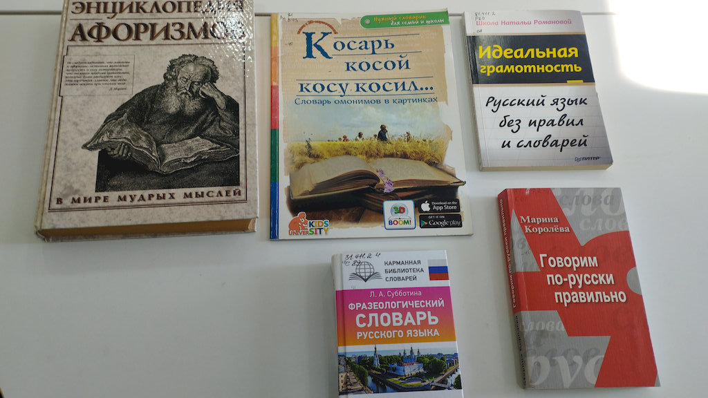 Библиотекарь предложила книги, которые вызвали большой интерес: «Фразеологический словарь русского языка» Л.А. Субботиной, «Русский язык без правил и словарей» Н. Романовой, «Говорим по-русски правильно» М. Королёвой, «Словарь омонимов в картинках» и «Энциклопедия афоризмов».