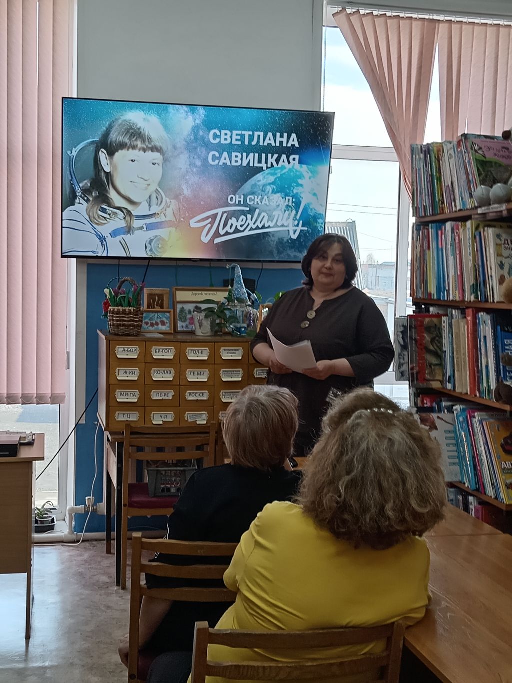 Час истории «Первый выход женщины в открытый космос» был посвящен Светлане Евгеньевне Савицкой. Участницы клуба узнали интересные факты из жизни Светланы Савицкой, почему она решила стать космонавтом, как готовилась к полету, какие были испытания, чтобы попасть в отряд космонавтов. Вспомнили о ней как о первой женщине, не просто вышедшей в открытый космос, но и выполнившей программу запланированных научных исследований, проведя за пределами корабля три с половиной часа.