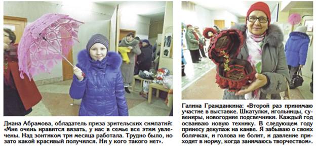С каждым годом появляются работы новых мастеров, а умельцы, традиционно принимающие в ней участие, как правило, осваивают другие виды творчества и дают возможность увидеть самобытные произведения. Так, Наталья Масс, открывшая дорогу на выставку вязаным куклам, в прошлом году познакомила с работами из бижутерии, выполненными в технике, которую никто еще не использовал. В этом сезоне она восхитила всех изящными цветами из фетра. «Радует, что люди чем-то увлечены, чем-то занимаются. Не останавливаются на каких-то одних техниках. Побывав на нашей выставке, они обмениваются опытом, пробуют себя в разных видах творчества,