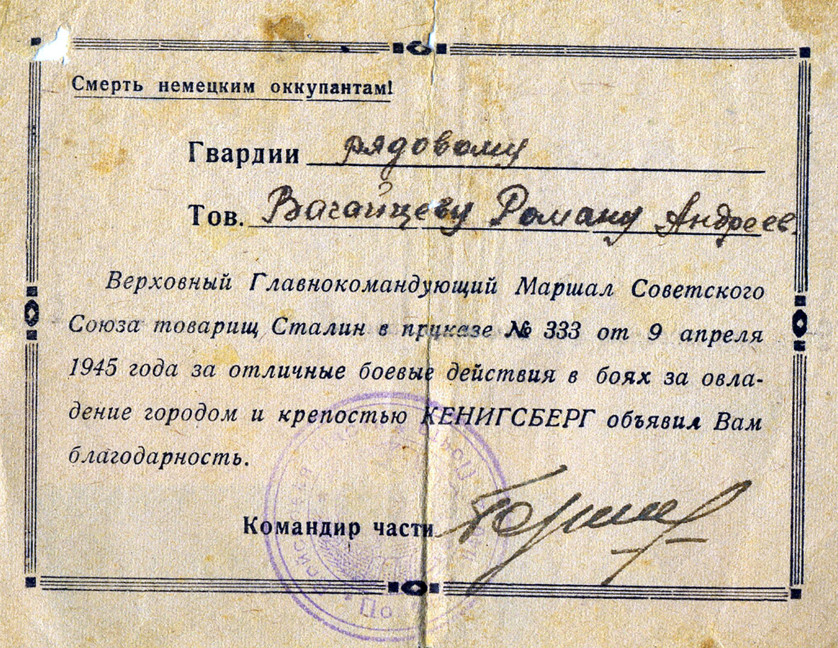 Вагайцев Роман Андреевич родился в с. Легостаево Новосибирской области. Прошел всю войну, воевал в Польше, был контужен. Его спасла женщина-полячка. Роман Андреевич попал в госпиталь, потом опять на фронт. В 1945 году демобилизовался. Всю свою жизнь работал, был на хорошем счету. В боях за освобождение Польши он был награжден орденом Отечественной войны I степени, но его посчитали мертвым и награду не вручили, и только через 25 лет награда нашла своего героя. Роман Андреевич имел много других межалей, но они не сохранились В сентябре 1979 года он умер, но его родные и сельчане помнят его до сих пор как трудолюбивого, порядочного человека.