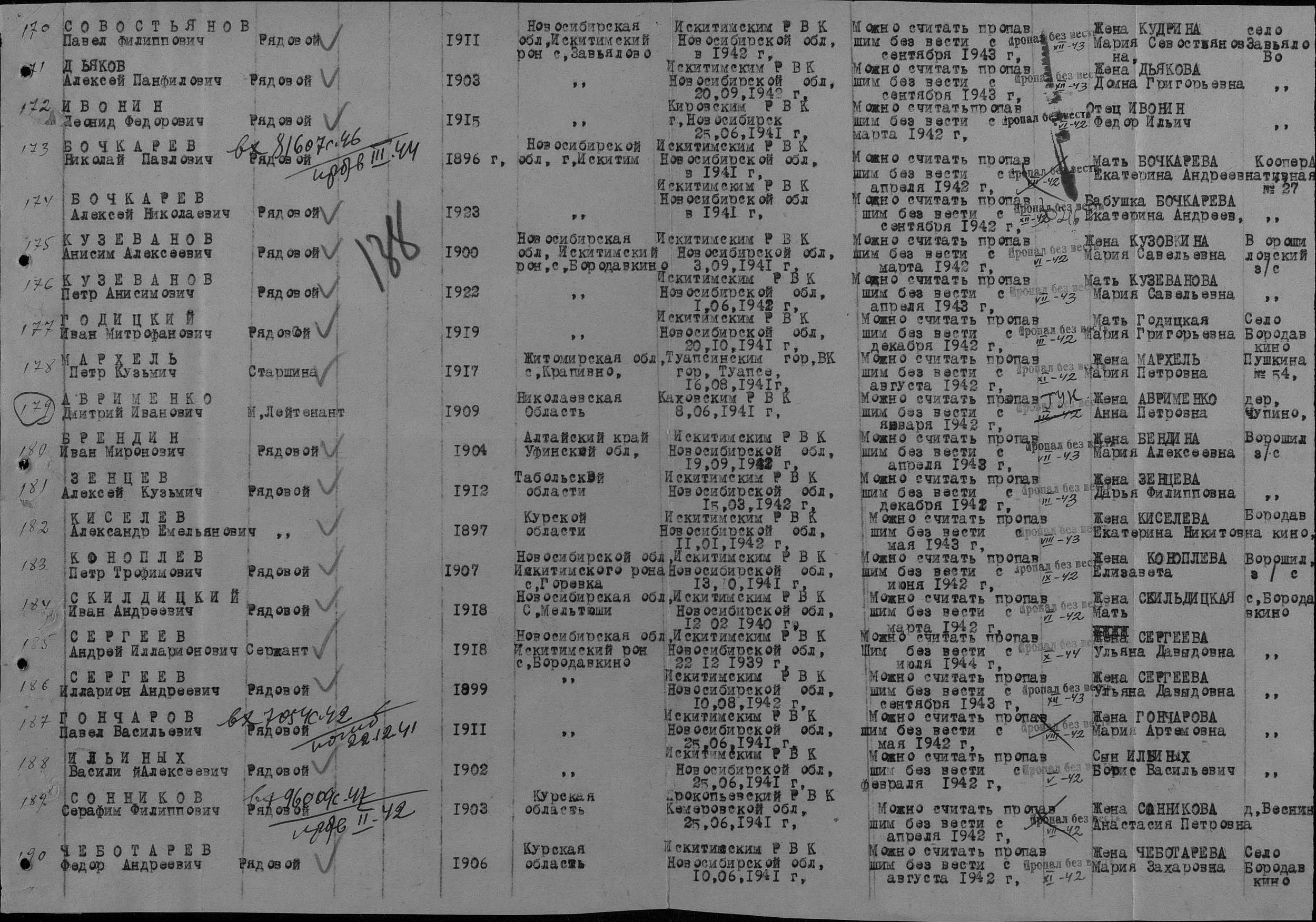 рядовой, 1903 г.р. Курская область. Проживал в д.Веснина. Призван Искитимским РВК в 1941году. 196 стрелкового полка, 35 стрелковой дивизии. Пропал без вести в феврале 1942 года.